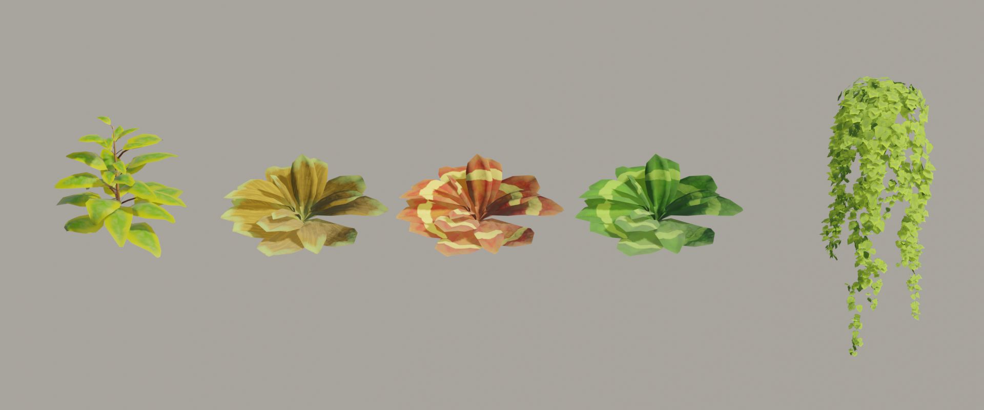 Pour m’entrainer aux textures j’ai décidé de faire 5 plantes avec un style dessin sur Substance Painter. J’ai pu les faire très rapidement en texturant qu’une feuille et en appliquant la texture sur chacune.